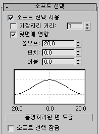 이 대화상자의 컨트롤을 사용하여 소프트 선택 매개변수를 수정할 수 있습니다. 모든 하위 오브젝트 수준에서 동일한 소프트 선택 매개변수 값을 공유합니다. Soft Selection은 NURBS, 메시, 다각형, 패치 및 스플라인 오브젝트에 사용할 수 있습니다.