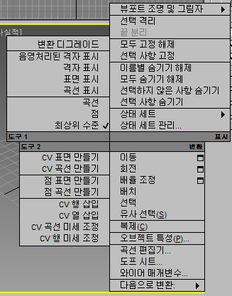 NURBS 오브젝트가 선택되고 수정 패널이 활성화되어 있으면 쿼드 메뉴에 NURBS 편집용으로 특별히 두 개의 사분면이 표시됩니다.