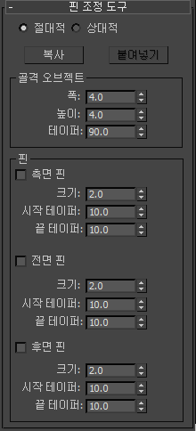 확인란을 사용하여 골격의 각 측면에서 핀을 토글하고 숫자 설정을 사용하여 핀의 크기 및 테이퍼 설정을 제어합니다.