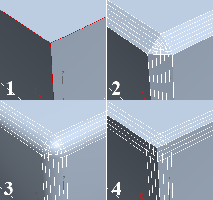 장력 설정은 동일 평면 다각형 사이의 가장자리에서 생성된 다각형에 영향을 주지 않습니다. 모따기한 가장자리에 인접한 원래 다각형 사이의 각도가 커질수록 더 많은 곡률을 사용할 수 있습니다.