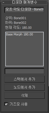 - 다른 오브젝트를 이 각도의 모프 대상으로 사용합니다. 이 옵션은 일반적인 모프 대상과 유사하지만 필드에서 발생하지 않고 관절 각도에서 발생합니다.