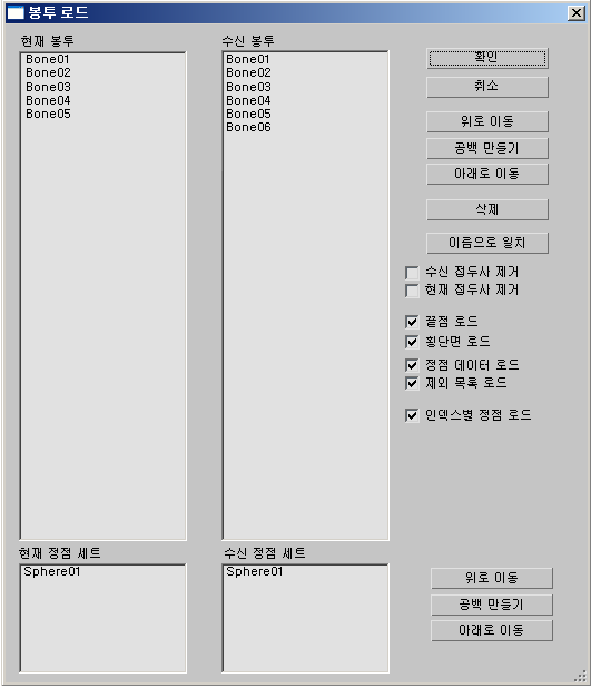 데이터가 저장된 골격과 다른 골격으로 데이터를 로드할 때 이 옵션을 사용합니다. 예를 들어 원래 골격에 3개의 손가락이 있고 새 골격에는 2개의 손가락만 있는 경우 손가락을 올바르게 정렬하려면 리스트에 공간을 추가해야 합니다.