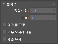 릴렉스 프로세스의 반복 횟수를 설정합니다. 각 반복에 대해 평균 위치가 재계산되고 릴렉스 값이 모든 정점에 재적용됩니다. 기본값은 1입니다.