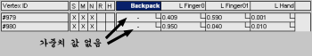 - 정점 ID를 드래그하여 정점을 선택한 다음 하나의 가중치를 클릭 및 드래그하여 골격에 대해 선택한 모든 가중치를 변경합니다.