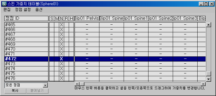 스킨 수정자의 가중치 테이블은 한 번에 여러 정점 및 골격의 정점 가중치를 변경하는 데 사용됩니다. 이 테이블은 가중치 테이블 버튼을 클릭하면 나타납니다.