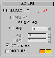 세분화에 앞서 수정된 오브젝트를 보여 주는 2색 와이어프레임 표시를 토글합니다. 케이지 색상은 확인란 오른쪽에 견본으로 표시됩니다. 첫 번째 색상이 정점 하위 오브젝트 수준에서 선택되지 않은 가장자리로 나타나고 두 번째 색상이 가장자리 하위 오브젝트 수준에서 선택되지 않은 가장자리로 나타납니다. 견본을 클릭하여 색상을 변경합니다.