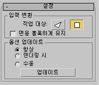 스무딩된 오브젝트가 너무 복잡하여 자동으로 업데이트할 수 없는 경우 수동 또는 렌더링 시 업데이트 옵션을 설정합니다. 또한 세분화 양 롤아웃에서 스무딩 정도를 더 크게 설정하여 렌더링할 때만 적용되도록 할 수 있습니다.
