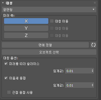 - X, Y 또는 Z 평면을 중심으로 메시를 미러링합니다.
