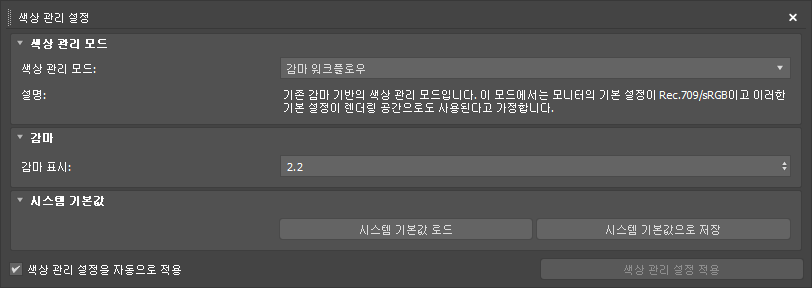 이 모드는 장면에 사용할 색상 관리 시스템을 제어하며 해당 대화상자는 각 모드에서 사용할 수 있는 설정을 반영하도록 업데이트됩니다. 색상 관리의 원칙 및 모드 간 차이점에 대한 자세한 내용은 색상 관리를 참조하십시오.
