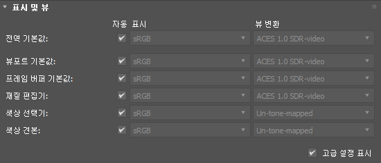 - 전역 기본값 설정을 사용하거나 전역 기본값 자체의 경우 OCIO 구성 파일의 기본 선택 사항을 사용합니다. 자동을 끄면 표시 및 뷰 옵션을 수동으로 설정할 수 있습니다.