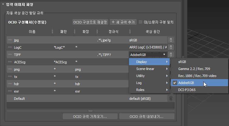 - 표에서는 파일 이름과 경로를 기준으로 입력 이미지에 색상 공간을 자동으로 지정하는 규칙을 보여 줍니다. 이미지 기반 텍스처는 음영 처리 계산을 위해 할당된 입력 공간에서 렌더링 공간으로 변환됩니다. 장면에서 텍스처로 사용할 이미지를 지정할 때 자동으로 할당된 색상 공간이 잘못된 경우 항상 변경할 수 있습니다.