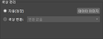 - 색상 관리 설정에 지정된 출력 색상 변환을 적용합니다. 자동이 설정된 경우 적용될 변환은 색상 변환 아래에서 읽기 전용으로 표시됩니다.