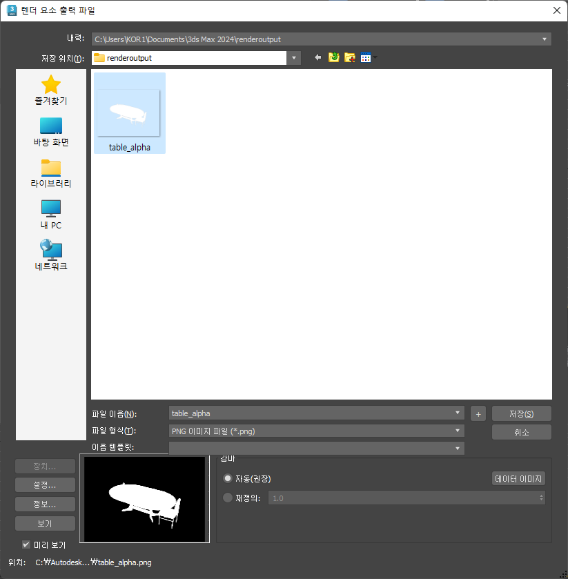 렌더 요소 출력 파일 대화상자에서는 렌더링의 한 요소를 저장하는 파일에 이름을 지정할 수 있습니다. 렌더링할 파일 유형을 결정하고 파일 유형에 따라 압축, 색상 깊이 및 품질과 같은 옵션을 설정할 수도 있습니다.