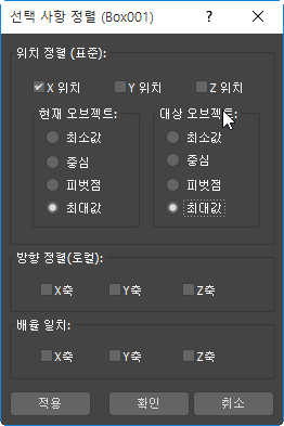 (정렬)을 클릭한 다음 Box001 오브젝트를 클릭합니다.