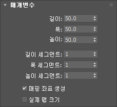 6. 수정 패널 매개변수 롤아웃에서 길이, 폭 및 높이를 50.0으로 설정합니다.