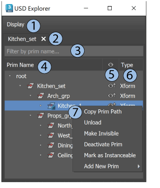 | 7 | Right-click context menu | Right-click a prim to enact contextual actions including the following: Copy Prim Path: Copies the prim path of the selected prim to your clipboard. Unload/Load/Load with Descendants: If applicable, such as for payloads, unloads or loads the prim from the scene depending on its current state. When Unload is selected, the prim and any descendants are unloaded from the scene. These changes are not saved in your 3ds Max scene or current session. Variant Sets: If applicable, lists the variant sets and variants available for the selected prim, letting you switch between variant options. To help you decipher variants in tree view, prims with composition arcs receive an "arc" badge. These changes are saved in your 3ds Max scene with edits saved in your session layer. Make Invisible/Visible: Toggles the visibility of the selected prim in the viewport. This option is renamed to Make Visible once a prim is hidden from the viewport. Make Visible will force all ancestor prims to be Inherits (changing their ancestor settings). If a prim is made invisible, its descendants are also made invisible. This state is also affected by the visibility/inherit toggle icon. Deactivate/Activate Prim: Toggles if a prim is enabled or disabled from a scene. Deactivate or delete a prim to disable it from a scene. This option is renamed to Activate Prim once a prim is deactivated/ made inactive. Note: You can toggle the visibility of inactive prims in the Explorer by selecting Display > Inactive Prims. These changes are saved in your 3ds Max scene with edits saved in your session layer. Mark as Instanceable: When toggled, the metadata on the prim is authored to be instanceable = true or false. Using this menu item, you can instance and de-instance prims. When you mark a prim as instanceable, instanceable = true. When you unmark a prim as instanceable, instanceable = false. These changes are saved in your 3ds Max scene with edits saved in your session layer. Add New Prim: You can add the following prim types (USD container objects) as children of a prim: Def, Scope, Xform, Capsule, Cone, Cube, Cylinder, Sphere. If you are an advanced user, you can script to register custom prims and select from the All Registered category in this menu to access the concrete prim types you have registered with your USD plug-in. |