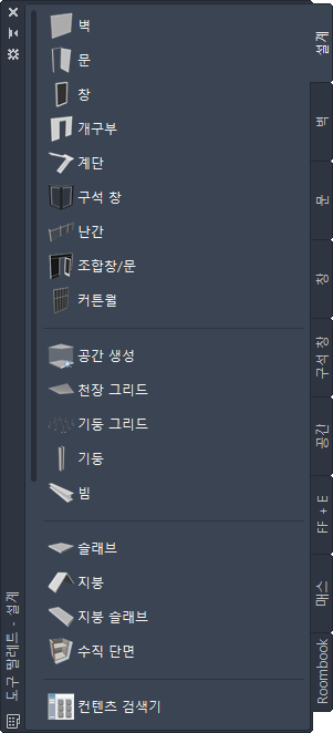 도구 팔레트는 모형에서 객체를 작성하기 위해 도구에 액세스할 때 가장 많이 사용되는 방법입니다. 표준 객체를 위한 도구와 특정 스타일 및 특성을 가진 객체를 위한 도구를 모두 사용할 수 있습니다. 도구 팔레트는 도구 팔레트 세트에서 도구 팔레트 그룹별로 구성됩니다. 자신만의 도구 팔레트를 작성할 수도 있고 컨텐츠 검색기에서 기존 도구 팔레트를 복사할 수도 있습니다.