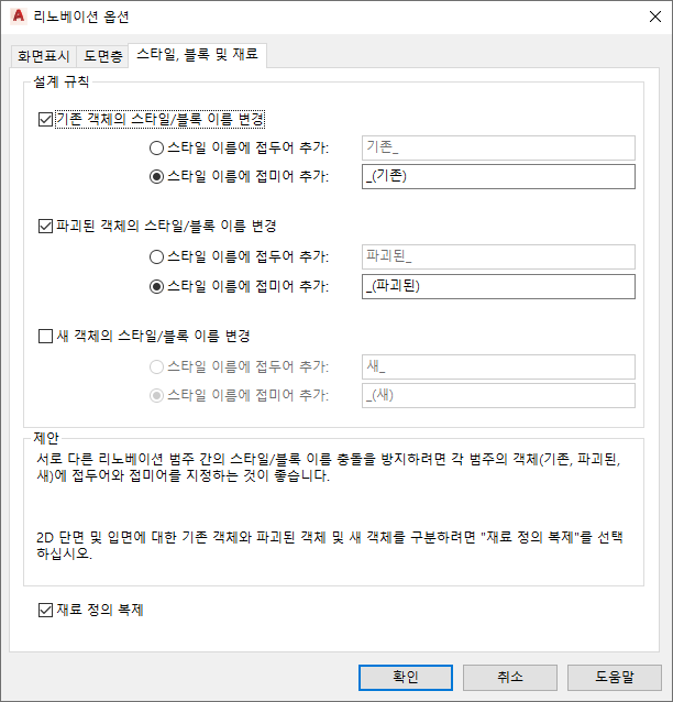 - 원하는 리노베이션 범주를 선택하고 현재 도면의 스타일/블록 이름에 추가할 접두어 또는 접미어를 지정합니다.