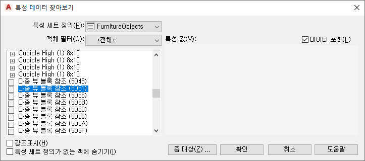 객체 또는 객체 스타일에 부착된 특성 세트를 선택할 때 도면에서 객체 강조하지 않음 | 강조 선택을 해제합니다. |