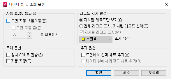 현재 도면에서 해당 객체를 선택할 때 데이터 뷰 윈도우에 나타나는 링크된 레코드의 모양을 조정합니다.