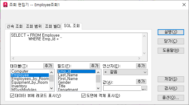 자유 형식 SQL 조회를 입력하거나 다양한 SQL 조회 도구를 사용하여 선택한 요소를 추가할 수 있는 공간을 제공합니다.