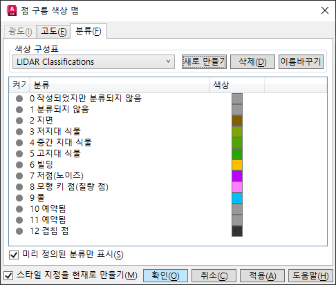 광도, 고도 및 분류 스타일 지정은 점 구름의 관련 점 데이터를 기준으로 점 구름의 색상을 지정합니다. "스펙트럼", "흙"과 같은 미리 정의된 색상 구성표를 선택하거나 구성표를 직접 작성할 수 있습니다. 광도 및 고도에 동일한 색상 구성표를 지정할 수도 있고 각기 다른 구성표를 지정할 수도 있습니다. 분류에는 별도의 구성표 세트가 있습니다.