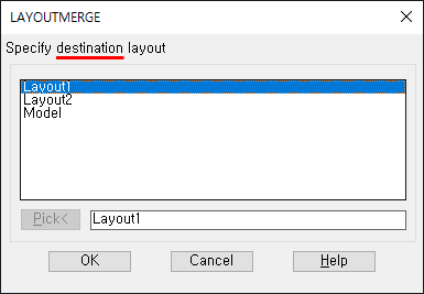 명령행 버전 -LAYOUTMERGE도 사용할 수 있습니다. 다음과 같은 프롬프트가 표시됩니다.