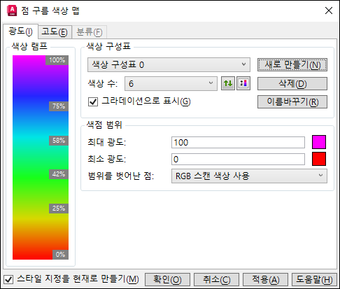 광도 점 구름 스타일 지정에 대한 색상 구성표 설정을 편집합니다.