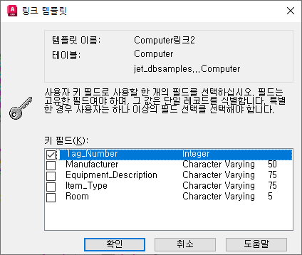 현재 데이터베이스 테이블에서 사용 가능한 모든 필드를 표시하며, 문자 필드의 경우에는 필드 유형 및 필드 길이까지도 표시합니다. 필드 이름의 왼쪽에 있는 확인란을 선택하여 링크 템플릿의 키 필드를 지정합니다.
