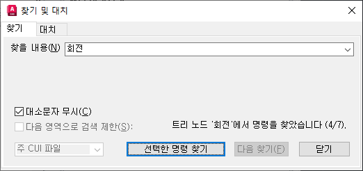 명령의 위치에 대해 상세히 설명하는 메시지가 표시됩니다. 즉, 사용자화 또는 특성 창에서의 정확한 위치 및 명령을 찾은 횟수가 표시됩니다.