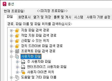 옵션 대화상자의 파일 탭에서 사용자화 파일 노드 옆에 있는 더하기 기호(+)를 클릭하여 노드를 확장합니다.