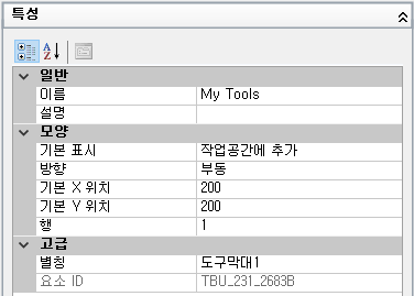 주: 여기서 도구막대의 특성을 변경하면 사용자화(CUIx) 파일이 로드된 후 나타나는 도구막대의 처음 모양에만 영향을 미칩니다. 작업공간을 사용하여 도구막대의 모양을 조정하는 것이 좋습니다.