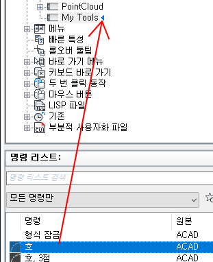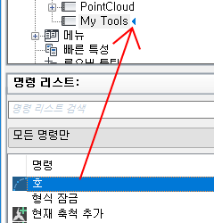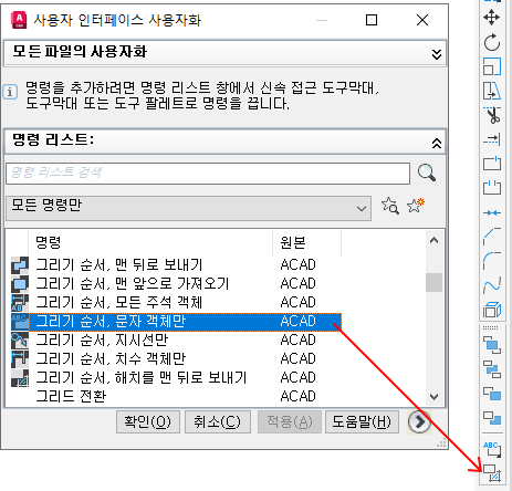 2. 도구막대에 추가할 명령을 명령 리스트 창에서 <파일 이름>의 사용자화 창으로 끕니다.
