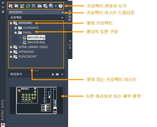 프로젝트 관리자는 다른 명령을 사용하는 중에도 화면에 유지되는 팔레트입니다. 고정, 크기 조정 및 자동 숨기기 설정이 가능합니다.