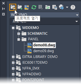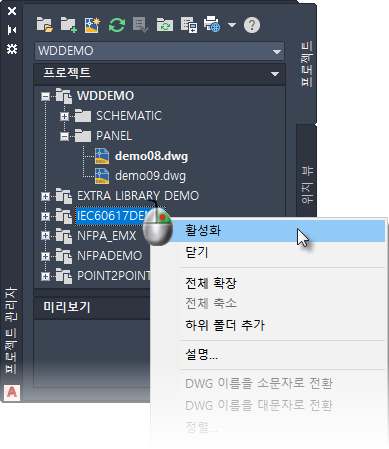 프로젝트 관리자에서 프로젝트는 원하는 대로 열 수 있지만 한 번에 하나의 프로젝트만 활성화될 수 있습니다. 프로젝트 전체 기능은 활성 프로젝트의 도면만 처리합니다.