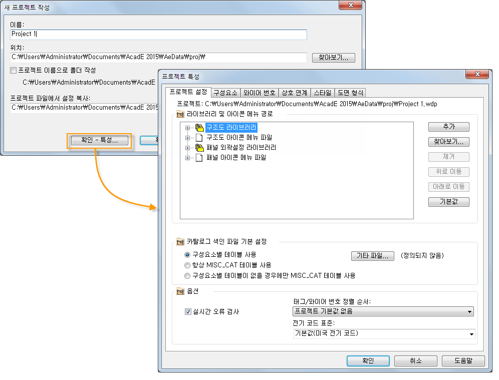 새 프로젝트를 시작하는 경우 또는 나중에 언제든지 라이브러리 경로, 도면 형식 및 참조 스타일 등의 프로젝트 특성을 정의합니다.