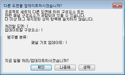 다른 도면을 업데이트하시겠습니까? 대화상자가 표시됩니다. 이 대화상자는 프로젝트 세트의 다른 도면에 하위 구성요소나 관련 패널 구성요소가 있음을 경고합니다.