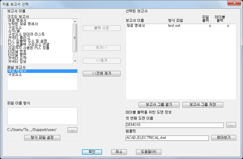 실행하려는 각 보고서의 보고서 이름 및 형식 파일(.set)을 선택합니다. 형식 파일은 파일 출력 또는 테이블 출력을 정의하거나, 둘 다 정의하기도 합니다.