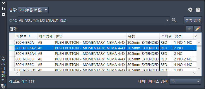 카탈로그 데이터베이스에서 카탈로그 값을 선택하고 연관된 도식적인 구성요소를 삽입합니다.