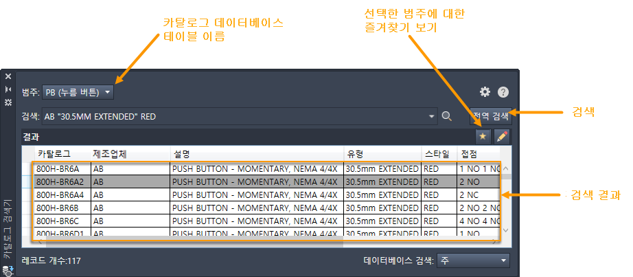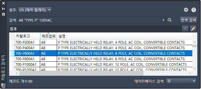 각 기호에는 주 카탈로그 값과 AutoCAD Electrical 도구 세트에서 "다중 카탈로그" 값으로 불리는 숫자가 있을 수 있습니다. 카탈로그 지정 사항을 추가하거나, 편집하거나, 제거하려면 구성요소를 편집합니다.