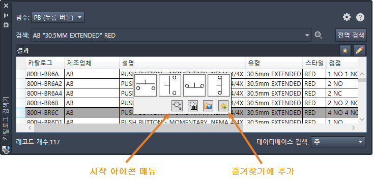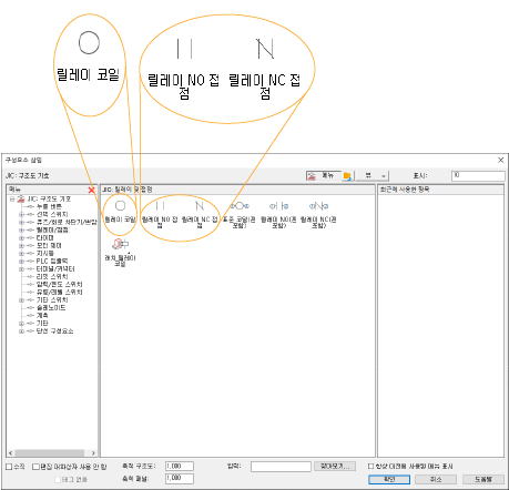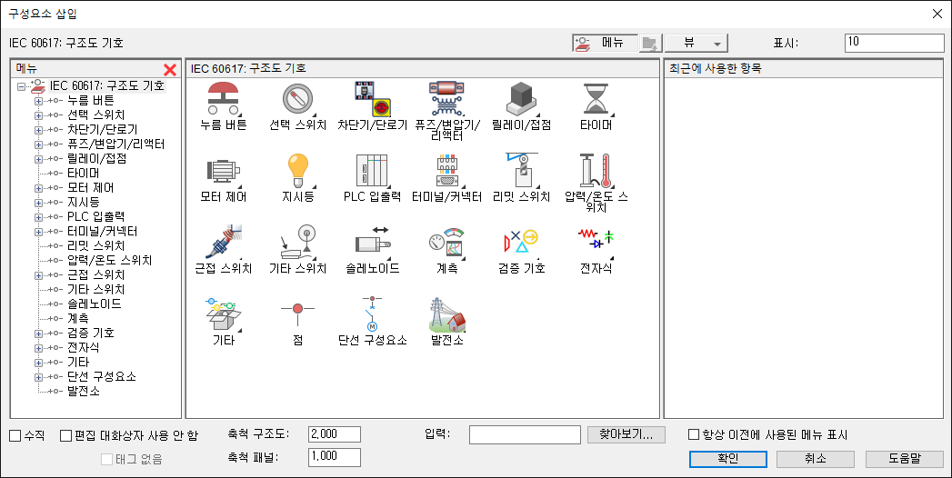 아이콘 메뉴에서는 기호 유형을 선택하여 기호를 삽입할 수 있습니다(예: NO 누름 버튼 또는 3 위치 선택 스위치). 기호가 삽입되고 나면 설명, 카탈로그 정보 등으로 기호에 주석을 달 수 있습니다.