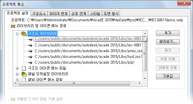 프로젝트 특성 대화상자의 프로젝트 설정 탭을 사용하여 특정 프로젝트에서 사용할 라이브러리 기호 세트의 경로를 정의합니다.