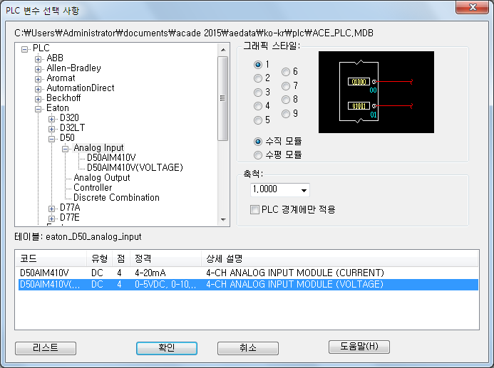 제조업체, 시리즈, 유형을 확장하여 PLC 모듈을 찾습니다. 도면 기본값과 다를 경우 PLC 스타일을 선택합니다. 모듈을 선택하고 확인을 클릭합니다. 좀 더 쉽게 배치할 수 있도록 모듈 윤곽선을 사용하여 삽입점을 선택합니다. 래크, 슬롯, 첫 번째 주소 등을 포함할 수 있는지에 대한 프롬프트에 응답합니다.