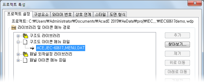 여러 라이브러리 세트마다 여러 가지 아이콘 메뉴가 있습니다. 프로젝트 특성 대화상자의 프로젝트 설정 탭을 사용하여 특정 프로젝트에서 사용할 아이콘 메뉴를 정의합니다.