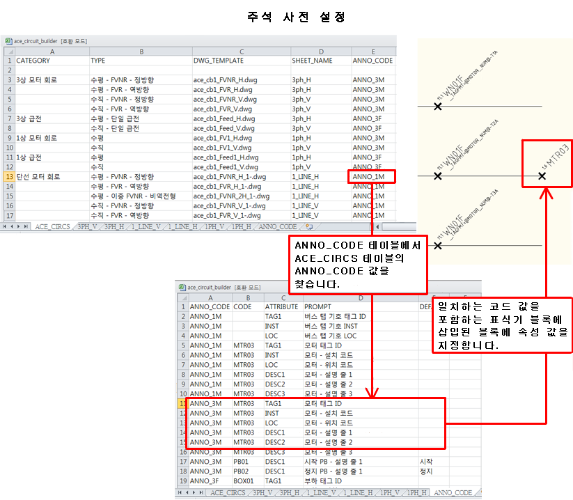 스프레드시트에서 ANNO_CODE 시트를 엽니다. 이 시트에서는 선택한 회로(ANNO_CODE 값으로 식별), 특정 표식기 블록(CODE 값으로 식별), 표식기 블록의 특정 속성 간 링크를 제공합니다.