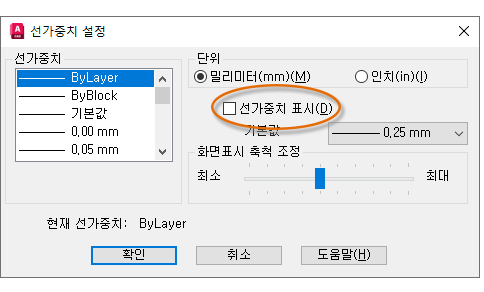 선가중치를 ByLayer로 설정한 상태로 두거나, 도면층의 선가중치를 재지정하는 값을 지정할 수 있습니다. 선가중치 미리보기가 동일하게 보이는 경우는 모니터에 대략적인 픽셀 폭으로 표시되기 때문입니다.