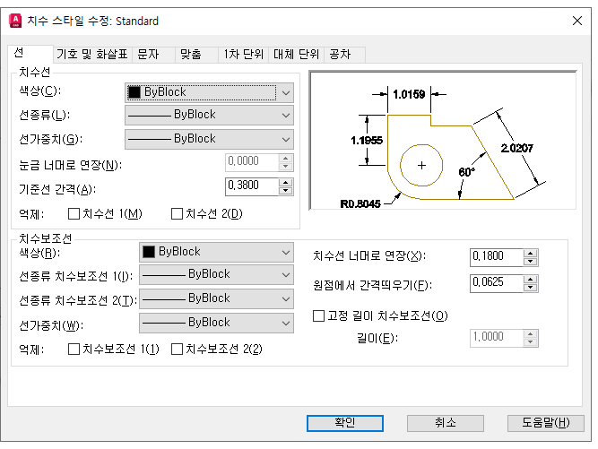 기본 치수 스타일의 이름은 표준(영국식) 또는 ISO-25(미터법)입니다. 기본 치수 스타일은 사용자가 다른 스타일을 현재 도면 스타일로 설정할 때까지 모든 치수에 지정됩니다.