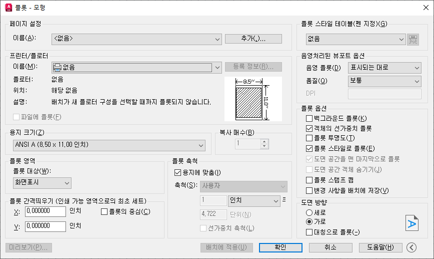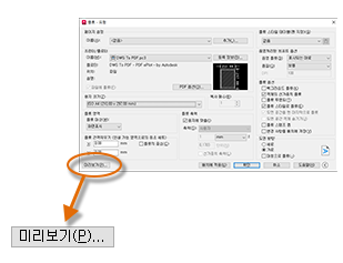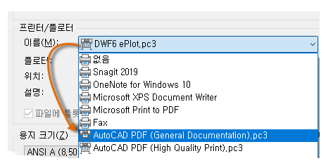 프린터/플로터 드롭다운 리스트에서 AutoCAD PDF(일반 문서).pc3을 선택합니다.