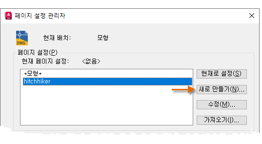 새 페이지 설정을 작성하려면 새로 만들기를 클릭하고 새 페이지 설정의 이름을 입력한 후 확인을 클릭합니다. 다음에 표시되는 페이지 설정 대화상자는 플롯 대화상자와 유사합니다. 저장할 모든 옵션 및 설정을 선택합니다.