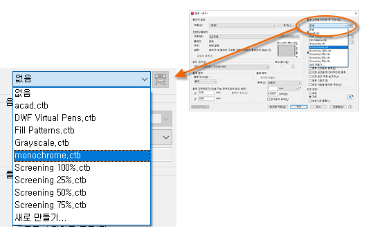 플롯 스타일 테이블은 색상 처리에 대한 정보를 제공합니다. 모니터에는 적절하게 표시된 색상이 PDF 파일이나 인쇄에는 적합하지 않을 수 있습니다. 예를 들면 도면은 컬러로 작성하지만 출력은 흑백으로 작성하려고 할 수 있습니다. 다음은 단색 출력을 지정하는 방법입니다.